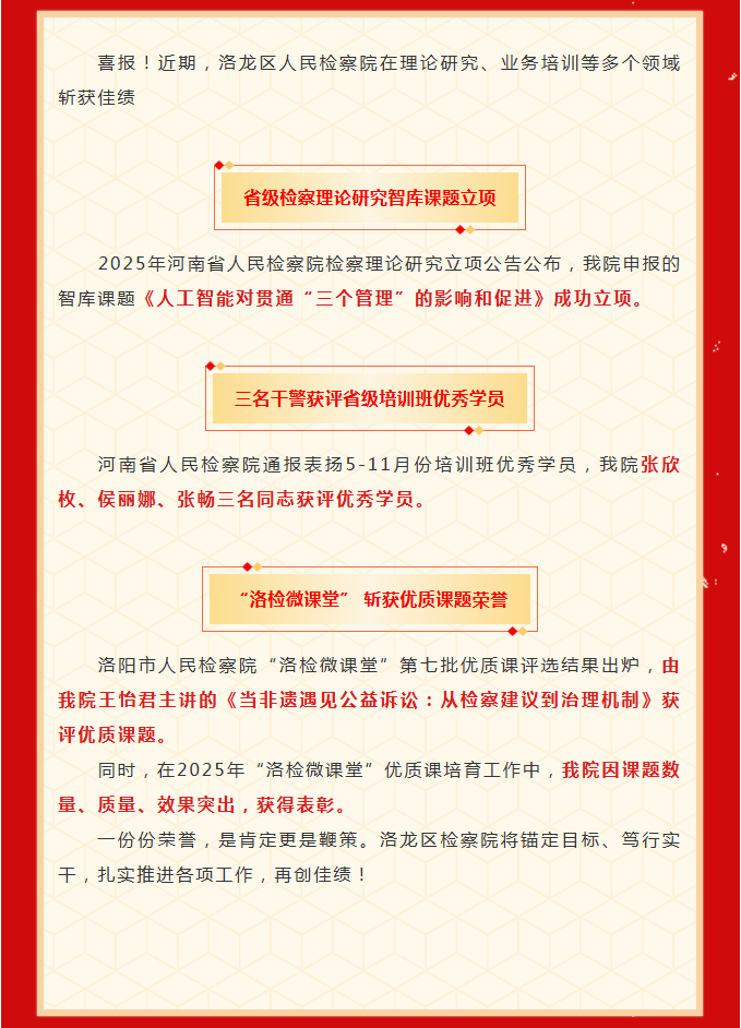喜报!近期,洛龙区人民检察院在理论研究、业务培训等多个领域斩获佳绩