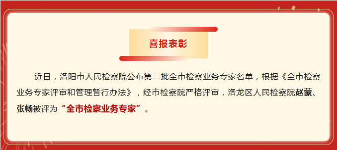 近日,洛阳市人民检察院公布第二批全市检察业务专家名单,根据《全市检察业务专家评审和管理暂行办法》,经市检察院严格评审,洛龙区人民检察院赵蒙、张畅被评为“全市检察业务专家”。