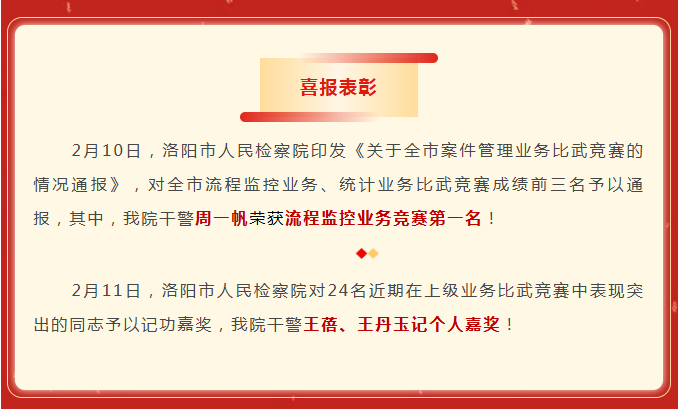 2月11日,洛阳市人民检察院对24名近期在上级业务比武竞赛中表现突出的同志予以记功嘉奖,我院干警王蓓、王丹玉记个人嘉奖!
