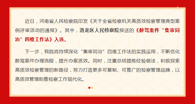近日,河南省人民检察院印发《关于全省检察机关高质效检察管理典型案例评审活动的通报》。其中,洛龙区人民检察院报送的《醉驾案件“集审同治”四维工作法》入选。