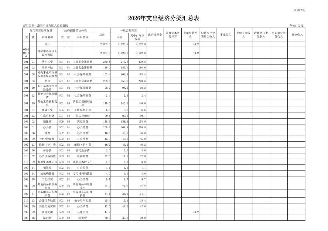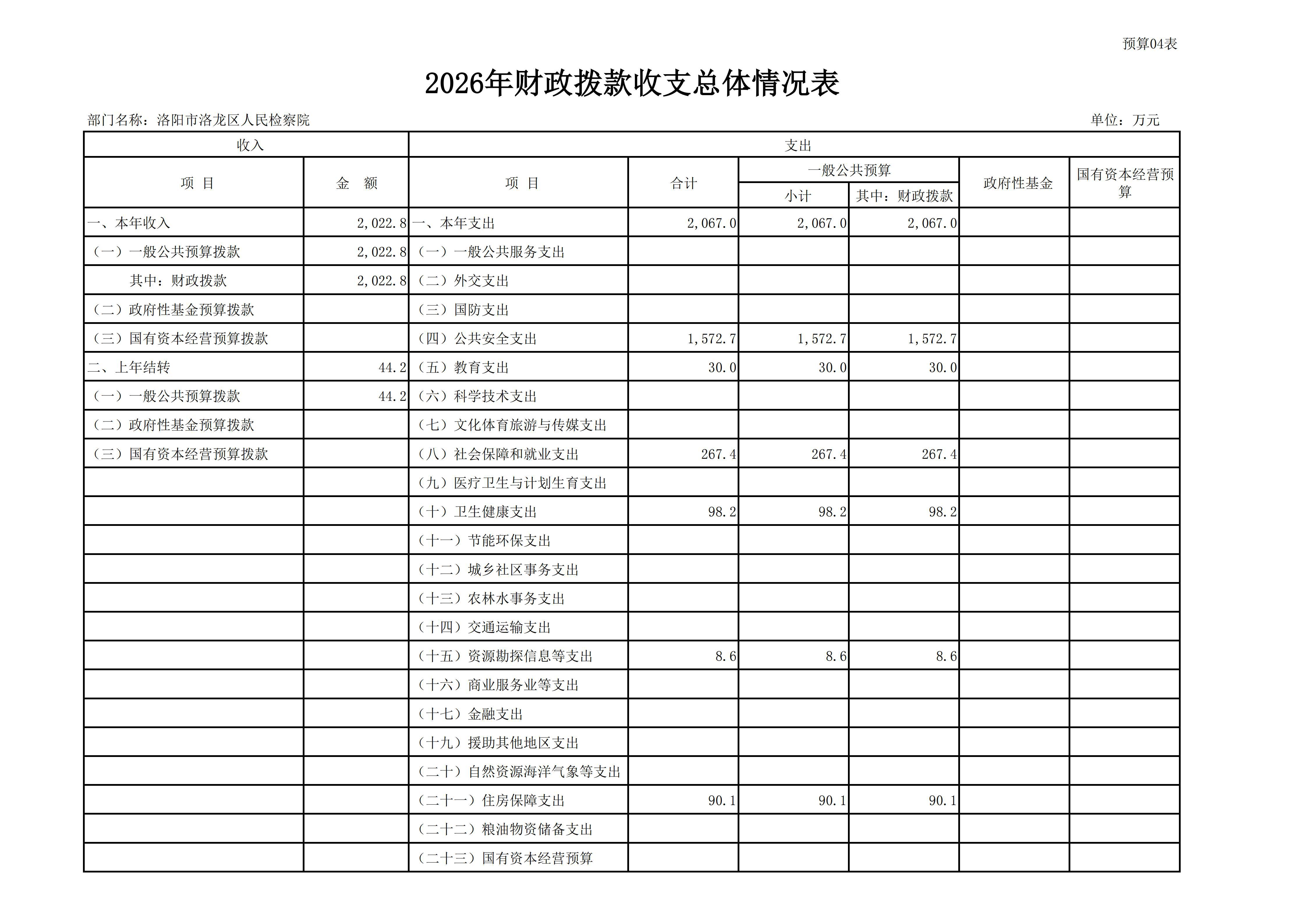 洛阳市洛龙区人民检察院2026年收入合计2067万元,其中:一般公共预算2022.8万元,上年结转结余44.2万元。